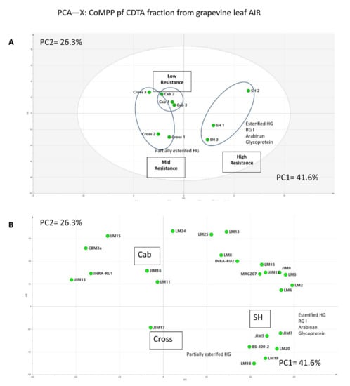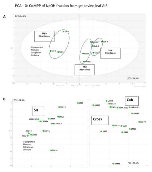 The CoMPP datasets of the NaOH fraction of the three cultivars yielded a heatmap (Figure 4) rich in hemicellulosic polymers, including mannans (mAb LM21), xyloglucan (mAbs LM15, LM24 and LM25) and xylan (mAb LM11). Glucan, cellulose and AGP were also detected by mAbs (mAbs BS-400-2, CBM3a, JIM8, JIM13), as well as the signals of galactan (mAb LM5) and arabinan (mAbs LM6 and LM13); these may again support the hypothesis that these side chains act as the linkages between RG I and hemicellulosic polymers [45]. The comparison between cultivars revealed the increasing trend of xyloglucan (with XXXG motif, recognized by mAb LM15). Hemicellulose polymers have been suggested to play critical roles in the strengthening of the plant cell wall structure, therefore elevating the plant resistance to stress. For example, the marked increase in arabinoxyloglucan has been stated to positively correlated with the resistance of tobacco to Botrytis cinerea [50]; the silencing of xylanases activity increased the xylan content and silique dehiscence resistance [51]; and a generally enriched hemicellulose was found in resistant wheat cultivar compared to cultivar susceptible to Fusarium Head Blight [52]. In addition to mAbs LM15, another hemicellulosic polymer, (galacto)(gluco)mannan (mAb LM21), showed a similar increasing pattern. Interestingly, similar to the CDTA fraction (Figure 2), an increasing trend was also observed for AGP epitope abundance, recognized by both mAbs JIM8 and JIM13, which again suggested their possible roles in grapevine/downy mildew interactions. To obtain further information on possible associations between polymers, the PCA score plot (Figure 5A) and loading plot (Figure 5B) were constructed from the CoMPP raw datasets of the NaOH fraction. In Figure 5A, it is very clear that those samples were well clustered into three groups on the horizontal dimension; cultivar “SH” has distinct distance from cultivar “Cab”, whereas cultivar “Cross” sits between them (PC1 explained by 28.6% variance). In the loading plot (Figure 4), the main variables driving this separation include AGP, mannan, xyloglucan and cellulose, which again support the heatmap datasets (Figure 4).