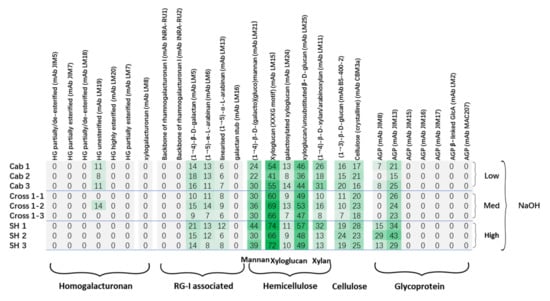 Comprehensive Microarray Polymer Profiling (CoMPP) analysis of NaOH extract of grapevine leaf cell wall AIR samples. The heatmap showed the relative abundance of plant cell wall glycan-associated structural motifs. The highest signal was set as 100, and others were adjusted accordingly; the color intensity is correlated to the mean spot signal. A cut-off (<5) was applied.
