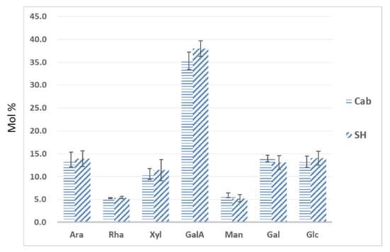 Gas chromatography (GC) has been routinely applied in cell wall analysis; it gives additional monosaccharide composition data for the validation of CoMPP analysis [32,33,37]. In this study, GC was applied to the most distinct samples (”SH” and “Cab”), and seven monosaccharides were analyzed (Figure 6). In general, leaf AIR from two cultivars contains a substantial amount of GalA (ca. 35–40 mol.%), with the presence of Ara (ca. 14–15%), Rha (ca. 5–7%) and Gal (ca. 13–14%), which suggests that leaf cell walls contain homogalacturonan (HG), rhamnogalacturonan I (RG I) and possibly rhamnogalacturonan II (RG II). On the other hand, the presence of Xyl (ca. 11–12%), Man (ca. 4–6%) and Glc (ca. 12–14%) suggests that xylan, xyloglucan and mannan are major components of the hemicellulosic fraction of grapevine leaf cell walls. These datasets show high similarity to the leaf sample of cultivar “Shiraz” [33], but different to the composition of tobacco leaves [36] and grape berry cell walls [37], this indicates the cell wall differences among the plant organs and tissues. Furthermore, the comparison between “Cab” and “SH” did not reveal significant differences among those monosaccharides; In addition to the markedly higher mol.% of GalA in cultivar “SH”, this may explain the generally higher abundance of mAbs that recognize HG (Figure 2). This result highlights the limitations of GC composition datasets, which tend not provide information on subtle structural differences, whereas CoMPP provides additional richer and complementary data on the polysaccharide structure by virtue of epitope abundance. In a previous study on grape berry cell wall deconstruction, the GC–MS did not show any significant changes between samples, whereas CoMPP was able to detect changes such as pectin de-esterification [37].