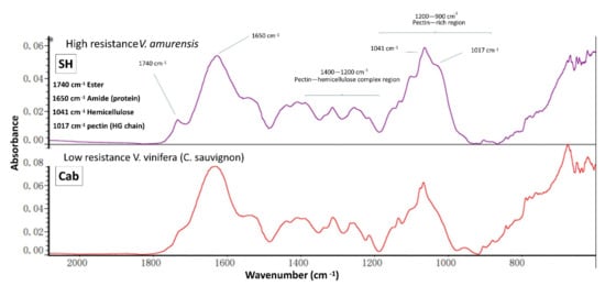 ATR-FT-MIR spectroscopy provides a fast and convenient method to detect the chemical functional groups present in cell wall samples [53]; it is usually applied in cell wall studies to provide a general overview of vibrational chemical bonds linked to polysaccharides and protein [31,33]. In this study, AIR samples sourced from cultivar “SH” and “Cab” were used for IR spectroscopy, generating wavescan spectral profiles (Figure 7) which can be used for comparisons. Two spectra were generated, both consisting of a number of maxima, including pectin HG at 1017 cm−1, xyloglucan at 1041 cm−1, amides at 1650 cm−1 and esterified pectin at 1740 cm−1 [53]. The comparison showed a similar spectral profile in general, which confirmed the finding from GC–MS and CoMPP, and reflects that bulk chemistry does not vary dramatically. However, few differences are worth noting: First, visual inspection indicated subtle difference in the shape of maxima at 1041 cm−1, which may suggest the structural differences in hemicellulosic polymers; this may be explained by the higher abundance of xyloglucan (with XXXG motif) found in Figure 4. The difference in maxima at 1017 cm−1 was also noted, which may indicate the higher pectin HG content in the “SH” AIR sample; however, the supporting data will be needed in future work as the GC–MS and CoMPP mainly focused on the non-cellulose fractions. Interestingly, the most significant difference between the two spectra is the maxima (1740 cm−1), which refer to esterified HG. This again supports the finding from Figure 2 and Figure 3 that indicated the cultivar “SH” has a higher abundance of esterified HG.