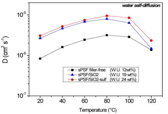In this study the 1H-PFG NMR technique was used to investigate the transport properties of water and methanol molecules confined in the porous structure of sPSf and composite membranes, and to check the effect of the inorganic fillers added. Firstly, water self-diffusion coefficients were measured on completely hydrated membranes, and the data are displayed in Figure 2 for the temperature range from 20 to 120 °C. As observed, the amount of water absorbed from the three membranes was quite different, and already from these data emerged the hydrophilic effect of the silica nanoparticles dispersed: the sPSf pristine membrane shows a water uptake of about 12 wt.%, while in the composites it significantly increased up to about 19 wt.% for the sPSf-SiO2 composite and up to 24 wt% for the sPSf-SiO2_sulf. Evidently, the different water content affected the diffusion coefficients, especially in the region of low temperatures, i.e., below 80 °C, where the water evaporation is negligible. Indeed, both composites promote higher mobility of the water molecules with coefficients 3 times higher than the filler-free membrane. In all cases, the self-diffusion, D, increased as the temperature increased due to the thermal motions, but at 80 °C the thermal energy was no more able to compensate the effect caused by the water evaporation: diffusion started to fall because most of the “free water” was lost from the membranes, and remained the hydration water to the hydrophilic groups, whose diffusivity was clearly inhibited.
