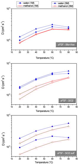 Self-diffusion coefficients of water and methanol in 1 and 5 M solutions confined in filler-free sPSf and the two composites, from 20 up to 80 °C.
