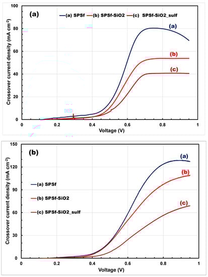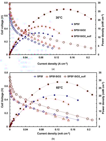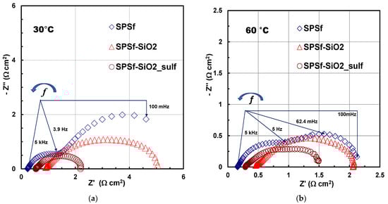 The same trend related to the charge transfer resistance of membranes is clearly observed by Nyquist plots reported in Figure 6b (at 60 °C), where each radius is the sum of two overlapped distorted semicircles of smaller amplitude, indicating an enhanced kinetic effect of the temperature on the reactions occurring at the cathode and anode. Additionally, the values of cell resistance, obtained at high frequency intercept on the x-axis, are lower at 60 °C compared with 30 °C (0.16, 0.30 and 0.48 cm2 for the MEAs based on filler-free SPSf, sPSf-SiO2_sulf and SPSf-SiO2, respectively).