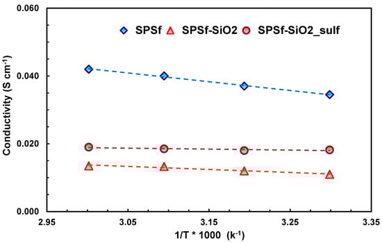 As above reported, the conductivity of the pristine sPSf was higher than the composite membranes (Figure 7), due to the fact that the introduction of an inorganic filler, showing very low or no proton conductivity at low temperature (30–60 °C), led to a tortuosity increase (the same phenomenon occurring for methanol permeation, but in the case of protons it reduced the conductivity), causing an increase of cell resistance (see Figure 6). The approach of modifying the surface characteristics of silica by sulfonation was demonstrated very useful to increase the proton conductivity, allowing in the future to tailor the sulfonation features of the polymer to design membranes with low methanol permeability (reducing the sulfonation degree of the polymer and using acidic functionalities on the fillers). The present results indicate that the composite membrane based on acidic silica (SPSf-SiO2_sulf) could potentially be used in high energy density DMFC devices due to a good compromise among low methanol crossover, low swelling due to reduced water/MeOH uptake, good conductivity and suitable DMFC performance.