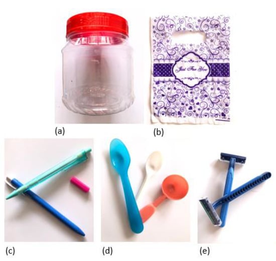 Biopolymer products: (a) food container, (b) plastic bag, (c) pens, (d) plastic spoon, and (e) shaving razor.