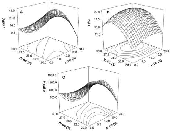 Effect of acetylated sugarcane fibre content (FC) and glycerol content (GC) on: (A) tensile strength (σ), (B) elongation (ε), and (C) young modulus of acetylated starch-based bio-composites reinforced with acetylated sugarcane fibre [46].