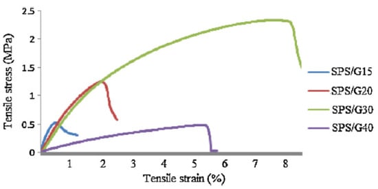 In terms of the product’s mechanical properties, as illustrated in Figure 6, it was found that SPS/G30 and SPS/G40 showed the typical pattern of rubbery starch plastic materials due to the linear increase in tensile stress at a low strain, followed by the curve toward the strain axis until failure occurred. The addition of plasticisers at 30 wt% and 40 wt% overcame starch brittleness and improved flexibility.
