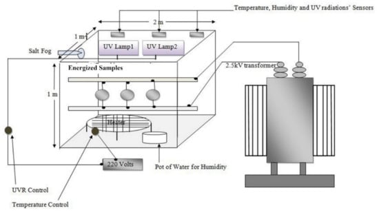 A chamber was developed according to the standards of the Electrical Power Research Institute (EPRI) and IEC-61109 with dimensions 1 m × 2 m × 1 m. The floor of the chamber was prepared from steel, while the walls were constructed with acrylic sheet [44,45]. The chamber was designed to provide multiple environmental stresses to the samples. Multiple stresses such as a test voltage of 2.5 kV, acid rain having 2.5 pH and salt fog of 5000 µS/cm were applied. For summer and winter cycles, temperature was kept at 47.2 and 35.3 °C, respectively. Acid rain was sprayed six times a day during summer and two times in winter. Exposure to UV-A radiations was for 10 h during summer cycles and for 8 h during winter cycles. Salt fog was only applied four times during winters. Each summer cycle was 11 days long, and each winter cycle was 17 days long. Total 28 weathering cycles were carried out continuously. The conditions employed during the experiment are summarized in Table 2 below [46].