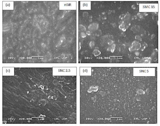 Therefore, good dispersion was achieved by using a high shear labortary mixer, and proper sonication was employed. SEM images of prepared samples are shown in Figure 2. It could be seen clearly that the proper dispersion of fillers was achieved and a better network with polymer was observed in the case of nano-silica as compared to the micro-silica. The interaction and dispersion of 5% nano-silica composite with silicon rubber was much better as compared to the 2.5% nanosilica and 15% micro-silica composite.
