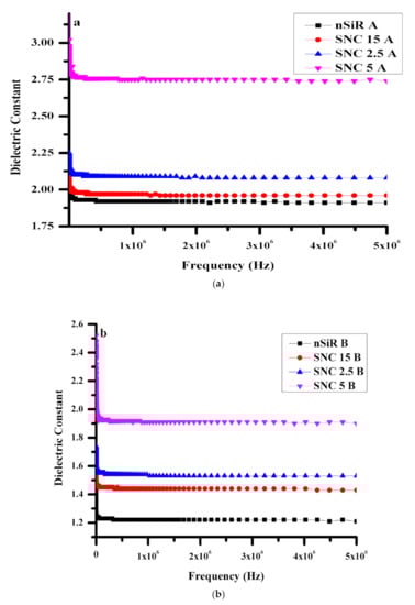 Dielectric constants were determined by the combination of ionic, electronic, and interfacial polarization. For polymeric materials, usually, a high dielectric constant is observed at low frequencies, butit decreases with an increase in frequency and eventually reaches a constant value. This trend can be explained by orientation of electric charge in one directionthat decreases with the increase in frequency. The higher dielectric constant of neatSiR and its other formulations is due to polar groups that align themselves with the applied electric field. In addition, infinite time is required for the charge carriers to align themselves. Therefore, as frequency increases, the dipoles fail to line up along their axes that are parallel to the applied AC field. As a consequence, the dielectric constant decreases with anincrease in frequency.