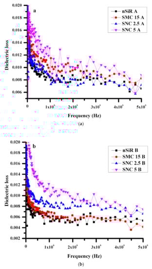Generally, dissipation energy or dielectric loss enhanced with enhancement in dielectric constant, and the same trend was observed in all experiments performed for this research. As shown in Figure 4a, the dielectric loss of unaged samples was decreased with an increase in frequency in accordance with the above discussion. At lower frequencies between 100 and 200 Hz, the dielectric loss was less than 0.02, and a gradual decrease was recorded as the frequency increased. Moreover, at frequencies higher than 3 MHz, the heat loss ranged from 0.002 to 0.010. By comparison, for the lower frequency range between 100 and 200 Hz, aged samples have exhibited an average dielectric loss of 0.02, 0.018, 0.012, and 0.010 for SNC5B, SNC2.5B, SMC15B, and nSiR, respectively. Nevertheless, at frequencies above 1MHz, all the composite samples generally retained steady values within a small range, as shown in Figure 4b.