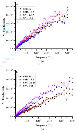 Conductivity (σAC) increases with the increase in frequency due to disturbance in the placement of neighboring sites of cations. In general, the same increasing trend was observed in all samples. In unaged samples of SNC (5% and 2.5%), higher conductivity was observed than the conductivity values of neat silicone rubber and SMC, as illustrated in Figure 5a. A comparison of Figure 5a,b reveals that before aging, there was no significant difference in conductivity values, but after aging, the conductivity values of neat silicone rubber and the micro-composite were lower than those of the nanocomposites. Furthermore, the conductivity values of the nanocomposites agreed with the heat dissipation results.