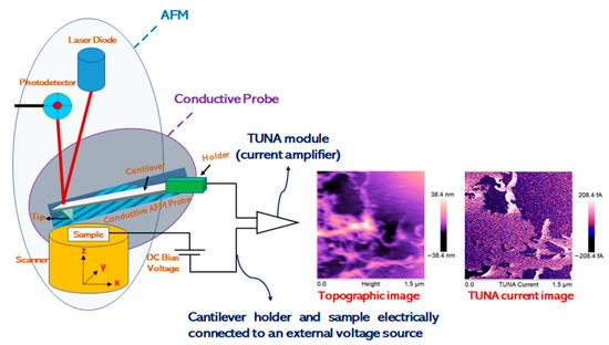 Figure 2 shows the schematic drawing of the Tunneling Atomic Force Microscopy (TUNA). The TUNA mode needs TUNA Module to be able to measure the electric properties of the analyzed samples. TUNA Module can be easily represented as a current amplifier used for amplification of electric charge acquired from the sample by a conductive AFM probe. The TUNA images were analyzed using the Bruker software Nanoscope Analysis 1.80 (Build R1.126200). To highlight the morphological peculiarities of both unfunctionalized and functionalized MWCNT, as well as their distribution within the polymeric matrix and their affinity with the globular rubber domains, the nanocomposites underwent etching treatment [35] before being investigated by TUNA. It is worth noting that thanks to the possibility of detecting currents and, at the same time, providing details on the fine morphological characteristics of the conductive nanocharge inside the host matrix, the TUNA technique gives helpful further information of the nanoscale material properties.