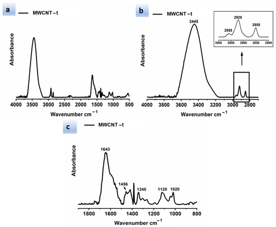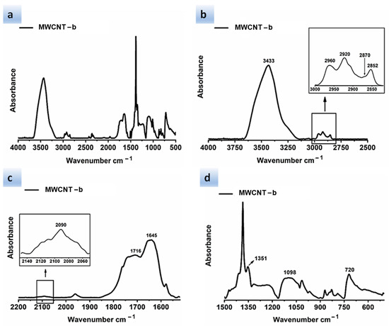 Figure 6 shows different spectral ranges of wavelengths for the FTIR spectrum of the MWCNT-t. In particular, Figure 6a–c show the following spectral ranges of 4000–500 cm−1, 4000–2700 cm−1 with inset at higher magnification, and 1900–800 cm−1, respectively.