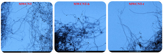 HRTEM pictures of MWCNT, MWCNT-b, and MWCNT-t nanoparticles.