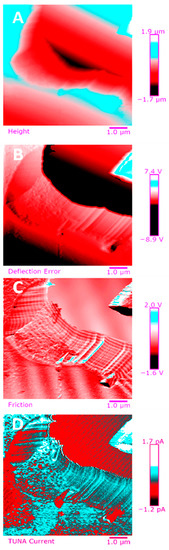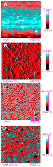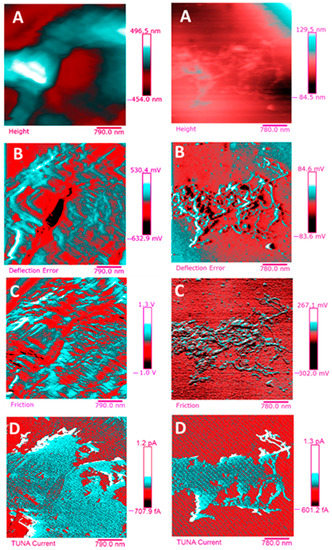 TUNA pictures (2D modality): (A) Height; (B) Deflection Error; (C) Friction; (D) TUNA Current of TCTBD+2%MWCNT–b (on the left) and TCTBD+2%MWCNT–t (on the right).