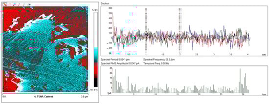 The TUNA module measures ultra-low currents (<1 pA) ranging from 80 fA to 120 pA circulating through the conductive tip to the investigated samples kept at a fixed DC bias. In this work, we used a DC sample bias from 1 to 2 V.
