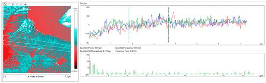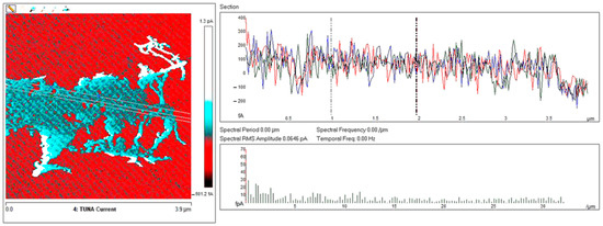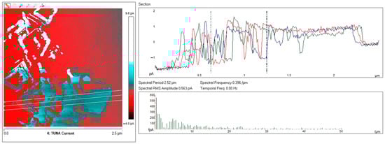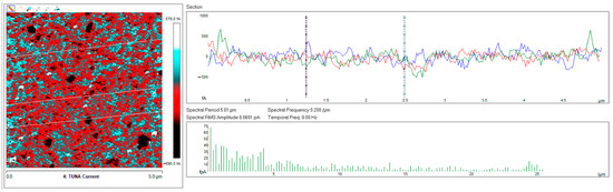 Highest resolution current mapping of the nanocomposites was obtained with the current sensitivity of the TUNA module which selects the gain referring to the output voltage of the TUNA sensor set to 1 pA/V, corresponding to the gain of 1012, scan rate of 0.500 Hz s−1, and number of pixels in X and Y (samples/line) set to 512.