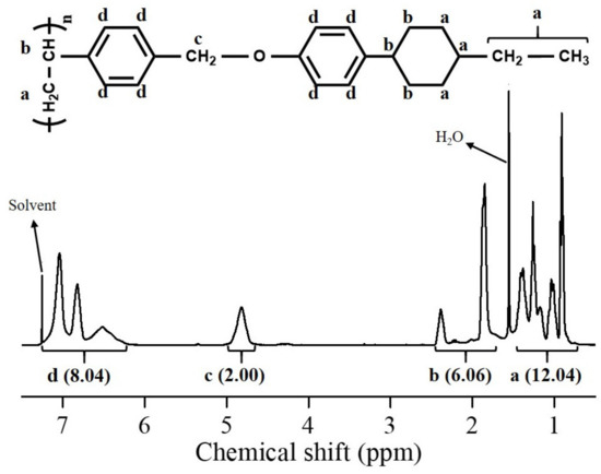 The synthetic routes to the PACH homopolymers (PECH, PPCH, PBCH, and PAmCH) and copolymers PECH# (PECH5, PECH10, PECH15, PECH20, PECH40, PECH60, and PECH80) are shown in Figure 1. Copolymers with different substitution ratios (mol%) were obtained by varying the molar ratio of 4-(trans-4-ethylcyclohexyl)phenol in the reaction mixture. Approximately 100% conversion of chloromethyl to oxymethyl was obtained when an excess (150 mol%) of the phenols was reacted with poly(4-chloromethylstyrene) at 70 °C for 24 h. Figure 2 shows the 1H NMR spectrum of PECH as an example. The chemical composition of the monomeric units in the obtained polymers was confirmed using 1H NMR spectroscopy. The 1H NMR spectrum and assignment of the respective peaks of PECH are shown in Figure 2. The 1H NMR spectrum of PECH indicates the presence of protons from PECH derivatives (δ/ppm = 0.51–1.50 (12H), 1.70–2.54 (6H), 4.62–5.07 (2H), 6.12–7.22 (8H); peaks a, b, c, and d. The degree of substitution from chloromethyl to oxymethyl was calculated to be approximately 100% by comparing the integrated area of the oxymethyl peak in the range 4.62–5.07 ppm and the phenyl group peaks in the range 6.12–7.22 ppm. Similar integrations and calculations for PECH# and PACH were performed and were typically within ±10% of the expected values. These polymers were soluble in medium-polarity solvents with low boiling points, such as tetrahydrofuran (THF) and chloroform, and in aprotic polar solvents, including N,N′-dimethylformamide (DMF) and N,N′-dimethylacetamide (DMAc). The solubility of the polymer samples in various solvents was sufficient for PECH# and PACH to be applied as thin-film materials. Among the organic solvents, THF was chosen as the coating solvent for thin-film fabrication because of its low eco-toxicity and good biodegradability [55]. In addition, these polymer thin-films can be fabricated at a low temperature based on a wet process, owing to their good solubility in volatile organic solvents.