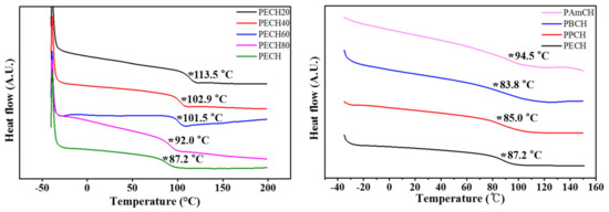 Differential scanning calorimetry (DSC) thermogram of PECH# (PECH20, PECH40, PECH60, and PECH80) and PACH (PECH, PPCH, PBCH, and PAmCH) (* indicates the glass transition).