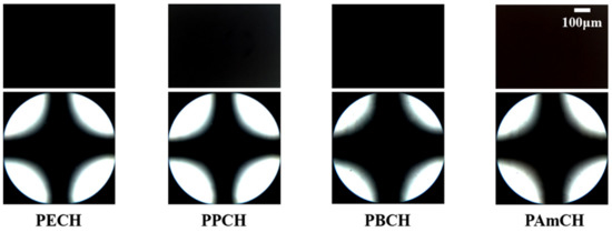 Orthoscopic (top) and conoscopic (bottom) polarized optical microscopy (POM) images of the LC cells fabricated with PECH, PPCH, PBCH, and PAmCH films.