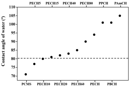 It is important to understand the relationship between the orientation behavior of the LC molecules and the surface properties of the polymer films in several areas of LC applications. It is known that LC molecules can be oriented vertically on the surface when the surface energy of the substrate is smaller than the surface tension of the LC [66,67,68]. It is well known that the low surface energy of polymer films, hydrophobic character of the surface, and low wettability has been implicated in the high contact angles of water on the polymer films [69,70]. Therefore, the static contact angle of water on the PECH# and PACH films was measured to investigate the effect of wettability on the LC orientation (Table 1 and Figure 6). The vertical orientation of LCs on PECH15, PECH20, PECH40, PECH60, PECH80, PECH, PPCH, PBCH, and PAmCH films was observed. The contact angles of water on the polymer films were 81, 82, 83, 85, 90, 94, 101, 101, and 105°, respectively. However, the LC cells fabricated with PCMS, PECH5, and PECH10 which had water contact angles of 71, 77, and 80°, respectively, did not show uniform vertical LC orientation behavior. Therefore, the vertical LC orientation behavior could be ascribed to the hydrophobic character of the polymer film, such as the water contact angle of approximately 81°.