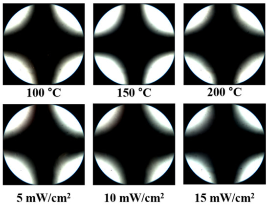 Conoscopic polarized optical microscopy (POM) images of the LC cells made using PECH films, after thermal treatment at 100, 150, and 200 °C for 10 min and UV treatment having intensities of 5, 10, and 15 mW/cm2 for 30 min, respectively.