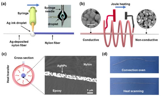 (a) Schematic of droplet-coating method (inset: microscopy image of the Ag ink droplet); (b) schematic of the heat-scanning process (inset: SEM images of sintered AgNPs (left) and as-deposited AgNPs (right), scale bar: 100 nm); (c) schematic of the heat transfer process (left) and the cross-sectional SEM image of an AgNP-deposited nylon fiber (right); and (d) digital images of fibers that were annealed by using a convection oven (150 °C) (left) and heat-scanning method (right).