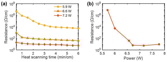 (a) Changes in the electrical resistances for AgNP-deposited fibers prepared by using various heat-scanning times and powers, and (b) electrical resistances for the AgNP-deposited fibers prepared by heat-scanning at various powers for 6 min/cm.