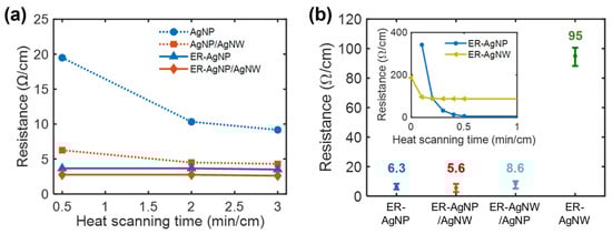 (a) Changes in electrical resistance with heat-scanning time (motor speed: 5 cm/s, power: 7.2 W) for the nylon fibers coated with AgNP, AgNP/AgNW, ER-AgNP, and ER-AgNP/AgNW. (b) Electrical resistances of the ER-AgNP, ER-AgNP/AgNW, ER-AgNW/AgNP, and ER-AgNW nylon fibers (five samples for each case) that were heat-scanned for 0.5 min/cm (inset: the initial resistance changes with heat-scanning time for ER-AgNP and ER-AgNW). The numbers inserted above the data points indicate the average resistance for each type.