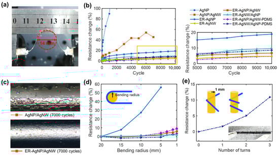 (a) Photograph of the cyclic bending setup with a fiber in a bent state. (b) The changes in electrical resistance (%) of various Ag-deposited fibers for 10,000 bending cycles (the plot on the right side corresponds to the marked area of the plot on the left side). (c) Optical microscopy images of AgNPs/AgNWs nylon fibers after 7000 bending cycles without and with the adhesion promoter (ER). (d) Electrical resistance changes of the Ag-deposited fibers with different static bending radii. (e) Electrical resistance changes of the ER-AgNWs/AgNPs-PDMS sample with spiral turns up to 3 times. The legend of (b) commonly corresponds to (b,d,e).