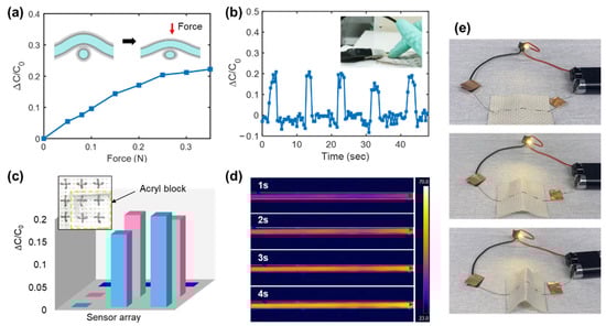 (a) Changes in the capacitance of a fiber sensor unit under applied force in a normal direction. The inset describes the cross section of the sensor unit. (b) Changes in the capacitance of the sensor unit when it was repeatedly and gently pressed with an index finger, as shown in the inset. (c) Changes in capacitance at each point of 3 × 3 sensor arrays when an acryl block was placed on the sensors. (d) Infrared thermal images of an ER-AgNP/AgNW-PDMS nylon fiber that was heated for 4 s. (e) Photographs of the light-emitting device (LED) powered through the conductive fiber that was subjected to bending.