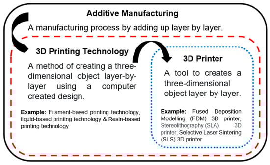 Additive manufacturing (AM), generally known as 3D printing, is a material-processing method of adding materials layer by layer to create a three-dimensional object. Polymer, metal, and ceramic can be applied in 3D printing. To avoid confusion, important terms are highlighted in Figure 1. AM is a term to describe a manufacturing process, 3D printing is the technology that performs AM, and a 3D printer is the processing tool. Before AM was introduced, subtractive manufacturing was applied in most manufacturing industries. A bigger piece of raw material is subtracted (scraped, dissolved, turned, and/or bored) to produce a specific shape of product [1]. Therefore, a lot of waste is produced, even though it is a faster processing method. AM achieves minimum waste scrap production, as the material adds up to the pinpoint location for every layer, making waste management insignificant. It is also an economically effective tool for small-batch production. There is high flexibility regarding product geometry, which can be varied from time to time or even from piece to piece without altering processing tools. To date, AM has emerged in many manufacturing divisions, including aerospace, and civil, biomedical, and automotive engineering [2]. Countless achievements have been marked during the history of the technology. The global 3D printing market is estimated to grow by approximately 17.00% CAGR and is expected to gain USD 4390 million by 2027 [3].