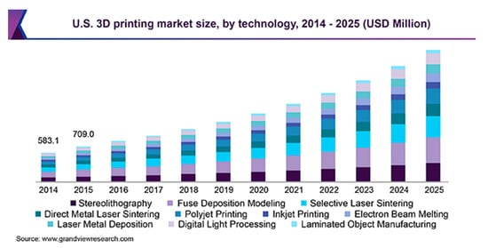 3D printing market size forecasting in the U.S., sorted by 3D printing technology, estimated based on 2017 [5].