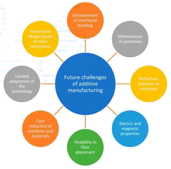 Technological challenges in the processing of continuous fiber and fiber sheets have resulted in more than 80% of studies on FDM composite materials using short fibers as a reinforcing agent. Nevertheless, the demand for stronger materials for AM will call for more applications of continuous fibers in the future. Apart from that, the future challenge in AM comes from the quantification of the interface properties of the composite. Currently, most interface properties are characterized qualitatively using scanning electron microscope (SEM) images. More detailed research is therefore required to evaluate the interfacial strength of composites. Fiber homogeneity and fiber alignment are also important factors that need to be considered in future works, as it will affect the transfer efficiency of stress from the matrix to the reinforcements.