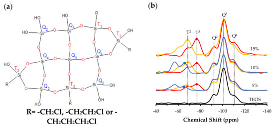 29Si NMR spectra were obtained to study the effect of chloroalkyl precursors on the relative abundance of silicon species in hybrid xerogels. In all cases, they showed the characteristic bands of the different species of silicon that can be found in this type of material, represented in Figure 1a.
