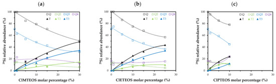 Variation in the relative abundance of the condensed species of Si with respect to percentage ClRTEOS obtained by integrating the 29Si NMR spectra for: (a) ClMTEOS, (b) ClETEOS, and (c) ClPTEOS.