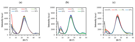 Figure 3 displays the XRD spectra of the xerogels synthesized with ClMTEOS, ClETEOS, and ClPTEOS. The diffraction pattern shows a broad signal at around 2θ = 24°, characteristic of amorphous silica. This signal corresponds to the distance between silicon atoms connected by siloxane bonds [49]. It can be observed that the intensity of this signal is reduced with an increased molar percentage of the precursor and that another signal arises with higher molar percentage of ClMTEOS and ClPTEOS (30% and 10%, respectively) at 2θ < 10°. The behavior of the ClETEOS series is different, observing the presence of this signal at the lowest molar percentage (1%) and an increase in its intensity with a larger amount of precursor. The 2θ < 10° signal is associated with the formation of ordered structures composed of T8 cages or ladders, which are, in turn, related to lamellar morphologies [51,52,53]. The distances calculated from this maximum correspond to the distance between the organic substituents in these structures [32]. The three series show this band at lower molar percentages in comparison to those previously observed for their alkyl equivalents, being detected in 70% of MTEOS, 30% of ETEOS, and 10% of PTEOS series [20,21,22]. This indicates a higher tendency for the chloroalkyl precursors to form ordered domains in the amorphous matrix. There is also a broad low-intensity signal at 2θ ~ 45°. According to Bragg’s law, these bands correspond to replicas of the signal at 2θ = 24°, which supports the presence of local periodicity in the silica matrix.