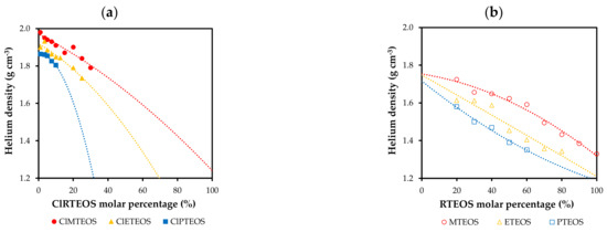 Skeletal density of the materials according to the precursor molar percentage for: (a) ClRTEOS series (ClMTEOS, ClETEOS, and ClPTEOS) and (b) RTEOS series (MTEOS, ETEOS, and PTEOS) in previous studies [20,21,22]. Reference material density (100%TEOS) = 1.96 g·cm−3.