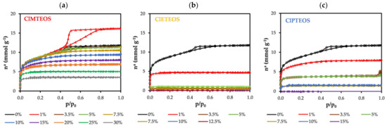 N2 isotherms (−196 °C) of chloroalkyl materials at different molar percentages of: (a) ClMTEOS, (b) ClETEOS, and (c) ClPTEOS.