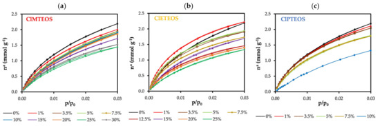 CO2 isotherms (0 °C) of chloroalkyl materials at different molar percentages of: (a) ClMTEOS, (b) ClETEOS, and (c) ClPTEOS.