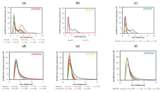 The DFT was also applied to calculate porosity distributions from N2 and CO2 adsorption data (Figure 7a–f, respectively), showing a similar influence of the precursor in both cases. Thus, N2 isotherm data show a progressive narrowing of the pores and a loss of mesoporosity with a higher percentage of precursor, and the CO2 isotherm data also show a sharpening of the micropore distribution. Note should be taken of the aforementioned irregular behaviors of: (i) 1% ClMTEOS material (Figure 7a), which has an increased pore size in comparison to the reference material, becoming more mesoporous, and (ii) the ClETEOS series (Figure 7b), whose ultramicroporous nature means that pore distribution values can only be obtained for the material with a molar percentage of 1%, observing a gradual loss of porosity with higher percentages of the precursor (Figure 7e).