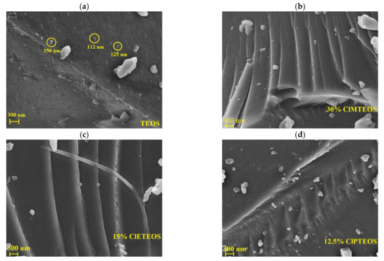 Micrographs of the ClETEOS series (Figure 8c and Figure S3d–f) show smooth flake-like surfaces consistent with the lack of N2 adsorption of this xerogels. The same pattern is observed in the ClPTEOS series (Figure 8d and Figure S3g–i), although a larger amount of precursor is needed to bring about these changes.