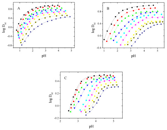 Extraction curves (log DM = f (pH)) of Pd(II) (A), Zn(II) (B) and Ni(II) (C) complexes. ★-1,