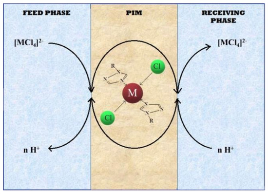 The use of 1-alkyltriazoles as carriers in PIMs allows the process to be carried out at low pH values. It is advantageous as hydrolysis is avoided under these conditions. Moreover, 1-alkyltriazoles as soft ligands (according to HSAB theory) could enable the separation of soft cations (e.g., Pt, Pd) from hard ones, e.g., Co, Zn, Ni.