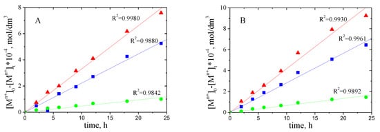 Then, the influence of the carrier concentration in the membrane on separation efficiency of the Pd(II), Zn(II) and Ni(II) ions from their equimolar mixture was determined. According to Danesi [53], if the relationship ln(C0,M − CM)/ = f(t) as a function of time shows a high linear correlation, the kinetics of metal ion transport across membranes was described by the following Equation:
