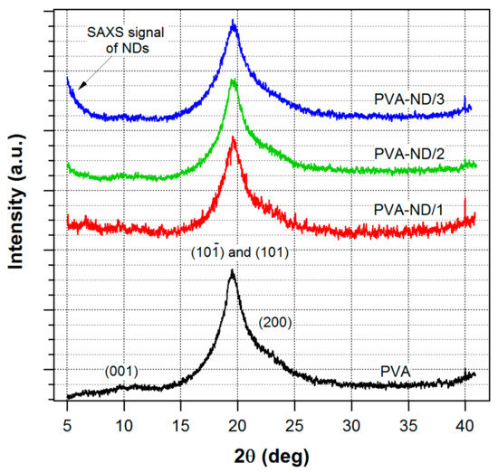 In contrast to WAXS, the SAXS profiles of the nanocomposites (Figure 4) were totally different compared to pure PVA. The SAXS intensities were orders of magnitude higher than in the case of the pure PVA film, and they showed a profile typical for ND agglomerates [72]. The reason for the difference in SAXS profiles of pure PVA vs. nanocomposites was that the presence of NDs in PVA led to a much stronger scattering in the SAXS than the scattering due to the PVA nanocrystallites in the PVA amorphous matrix and, thus, the scattering of the PVA nanocrystallites was negligible in the strong scattering originating from the ND particles. Moreover, the SAXS profiles of the nanocomposites did not differ substantially from the scattering profiles of the initial NDs dispersions used for the preparation of the films prepared in this work. These dispersions were studied in our previous work [61]. Thus, the structure of the ND aggregates did not substantially change after the addition into the PVA.