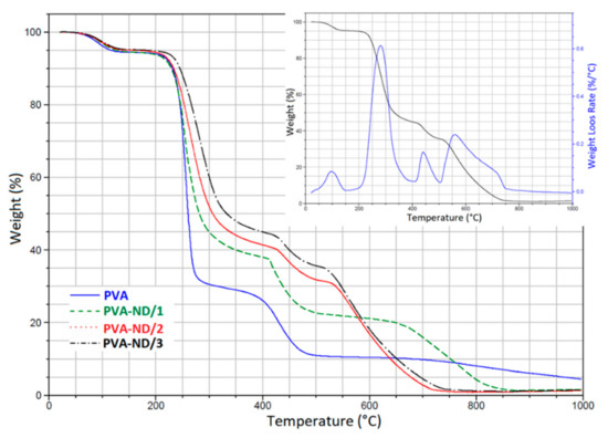 The presence of NDs in the PVA structure clearly changed the degradation profile of the PVA-ND nanocomposites (Figure 8). Particularly, the three-step degradation diagram observed for PVA was changed to four steps for the PVA-ND nanocomposite films, as shown in the DTGA graph of the PVA-ND/3 nanocomposite (Figure 8 insert). The degradation was milder in the PVA-NDs nanocomposites than in the PVA, which was due to the incorporation of the ND nanoparticles into the PVA structure. The first stage of degradation occurred in the temperature range of ~30–145 °C owing to the evaporation of water. Stage two was from ~190 to 380 °C. The highest weight loss of 65% was seen for PVA-ND/1 (5% of the ND), and the lowest weight loss of 50% was observed for PVA-ND/3 (28% of the ND). The third step of decomposition of the PVA-ND nanocomposites could be observed at ~415–510 °C. The fourth decomposition stage was observed in the temperature range of ~515–750 °C for the PVA-ND/2 and PVA-ND/3 samples and of 630–870 °C for the PVA-ND1 sample. The fourth decomposition step was due to oxidative etching, where the carbon was oxidized to form carbon dioxide (CO2). The shift of the mentioned fourth decomposition stage to lower temperatures for the PVA-ND/2 and PVA-ND/3 samples was caused by a higher content of ND, which degraded totally around 570 °C in the pure state [61]. A comparison of TGA curves of the nanocomposites with that of pure PVA at high temperatures (above 500 °C) showed an interesting fact that ND acted as a catalyst of thermal decomposition of PVA in this temperature range. The nanocomposite samples were almost totally degraded at 870 °C in the case of PVA-ND/1 and at 750 °C in the case of both PVA-ND/2 and PVA-ND/3, while the pure PVA sample still showed a non-negligible residual weight even at 1000 °C. The residual weight at 1000 °C was ~1% for PVA-ND nanocomposites and ~5% for PVA.