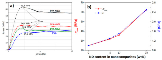 The curves in Figure 10a clearly indicated that the tensile properties (strength, modulus, toughness) enhanced with an increasing amount of ND in the samples. Furthermore, the PVA-ND/3 film showed a substantially higher tensile strength (63.3 MPa) than both the PVA-ND/1 and PVA-ND/2 films (32.2 and 36.4 MPa, respectively). Figure 10b shows the relationship between the maximum tensile strength (σmax) and Young’s modulus (E), depending on the ND content in the PVA-NDs nanocomposites. The modulus of the PVA-ND/3 nanocomposite was found to be about 150% higher than in the case of pure PVA film. The high mechanical performance of the PVA-ND nanocomposites also showed that a good dispersion of the numerous small ND agglomerates, as mentioned in SEM, TEM, and SAXS/WAXS, together with a strong interaction between the PVA and NDs, was achieved.