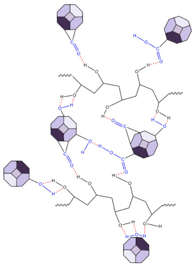 The ND-containing PVA nanocomposites exhibited two strong characteristic bands at 1324 and 1618 cm−1, which were not present in the Raman spectra of PVA. More specifically, the band at 1324 cm−1 was characteristic of sp3 carbon bonding (the diamond band), and that at 1618 cm−1 (G-band) was typical for graphite or sp2 bonding [68,69]. The intensity of the diamond band (1324 cm−1) and the G-band (1618 cm−1) increased with the ND content. For the PVA-ND/3 film, the intensity was reduced due to the high concentration of NDs in the matrix (28%), causing the shading of the bonds owing to the nanodiamond particles. Furthermore, the crystalline bands of PVA at 1144 cm−1, 1121 cm−1, and 855 cm−1 decreased with increasing ND content to a greater extent than the decrease in the relative amount of PVA, particularly for the PVA-ND/3 sample, which indicated a decrease in the PVA crystallinity—fewer polymer chains were participating in this stretching. This corresponded well with the WAXS and DSC results, as discussed in Section 3.3 and 3.6, respectively. The decrease in the 918 cm−1 and 855 cm−1 bands was due to the replacement of the C–C bonds of the PVA backbone by the hydrogen bonds between the NDs and the PVA. The oxygen-containing functional groups (CO, COOH, OH) on the surface of the NDs participated (see Scheme 1) to create strong interaction, including hydrogen bonding between the NDs and the PVA while restricting the PVA’s crystallization [31]. The proposed interactions between PVA and ND particles are illustrated in Scheme 1.
